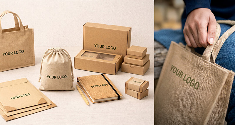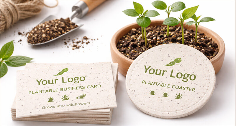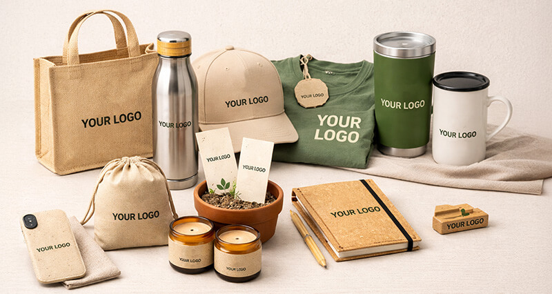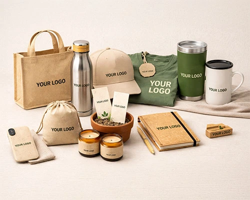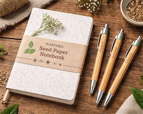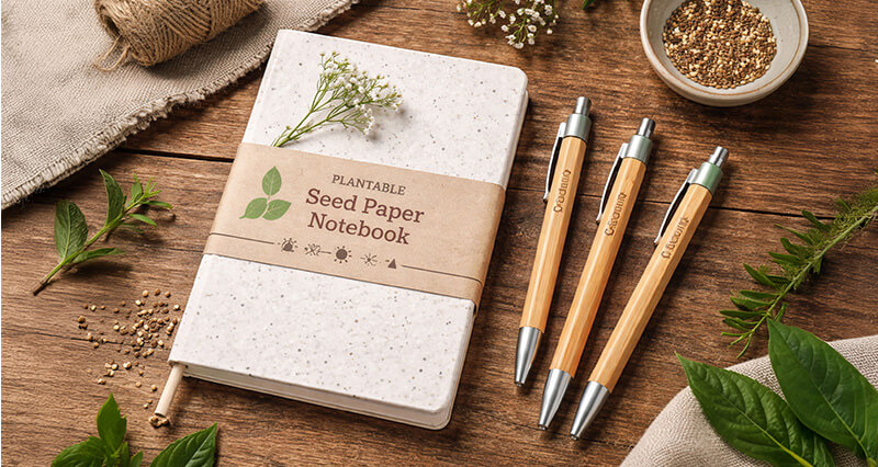 Organic cotton, bamboo, cork, hemp, and jute are increasingly used in branded merchandise. Products like seed-paper notebooks or bamboo pens connect brands with nature and highlight renewable materials.