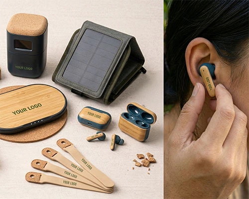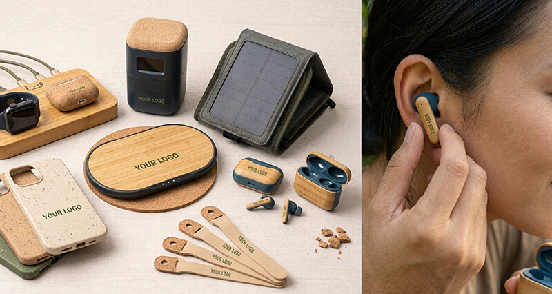 Solar-powered chargers, bamboo phone stands, and recyclable USB drives combine technology with sustainability — perfect for modern, eco-aware workplaces.